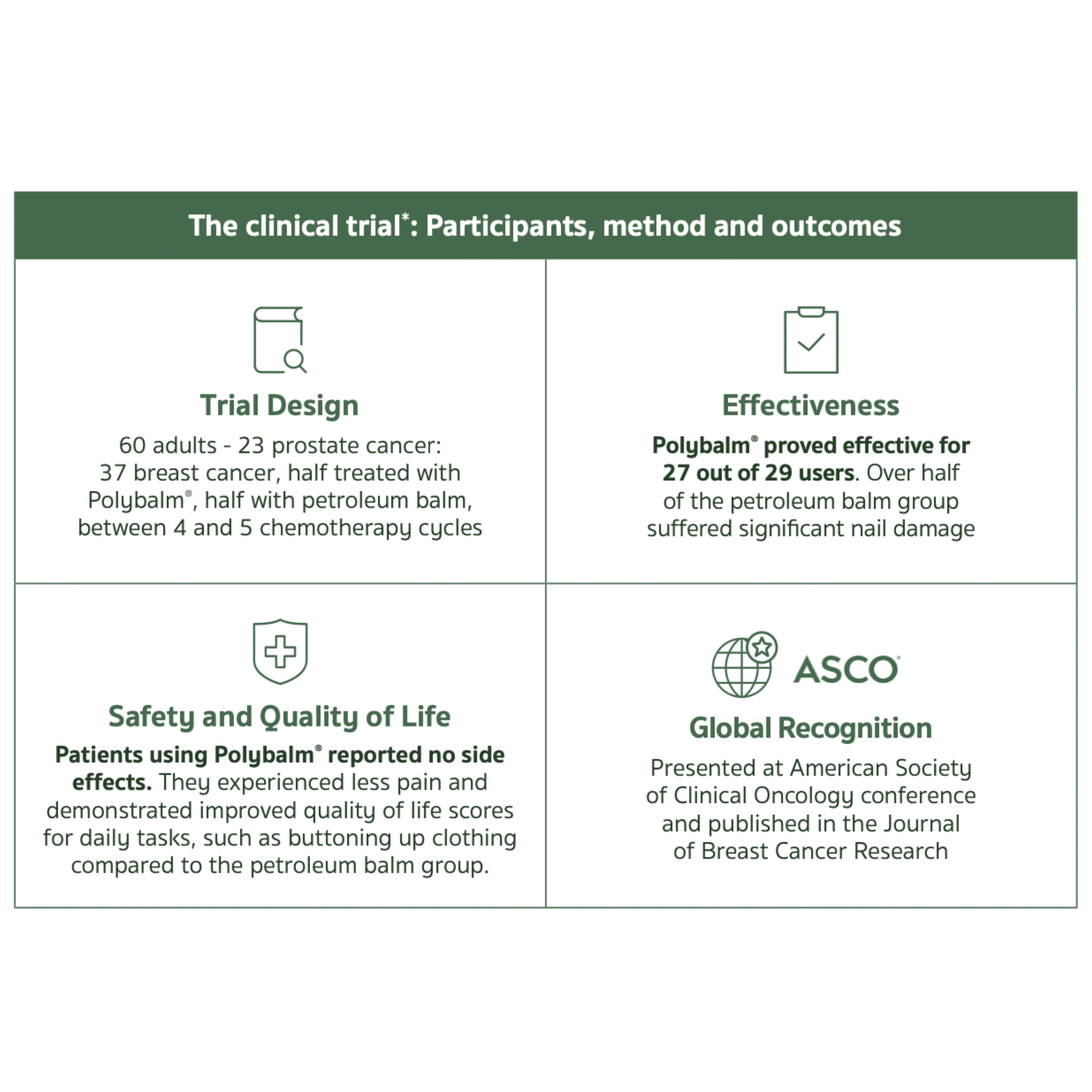A clinical trial with 60 adults (23 with prostate cancer and 37 with breast cancer) compared Polybalm to a standard petroleum balm during 4–5 chemotherapy cycles.