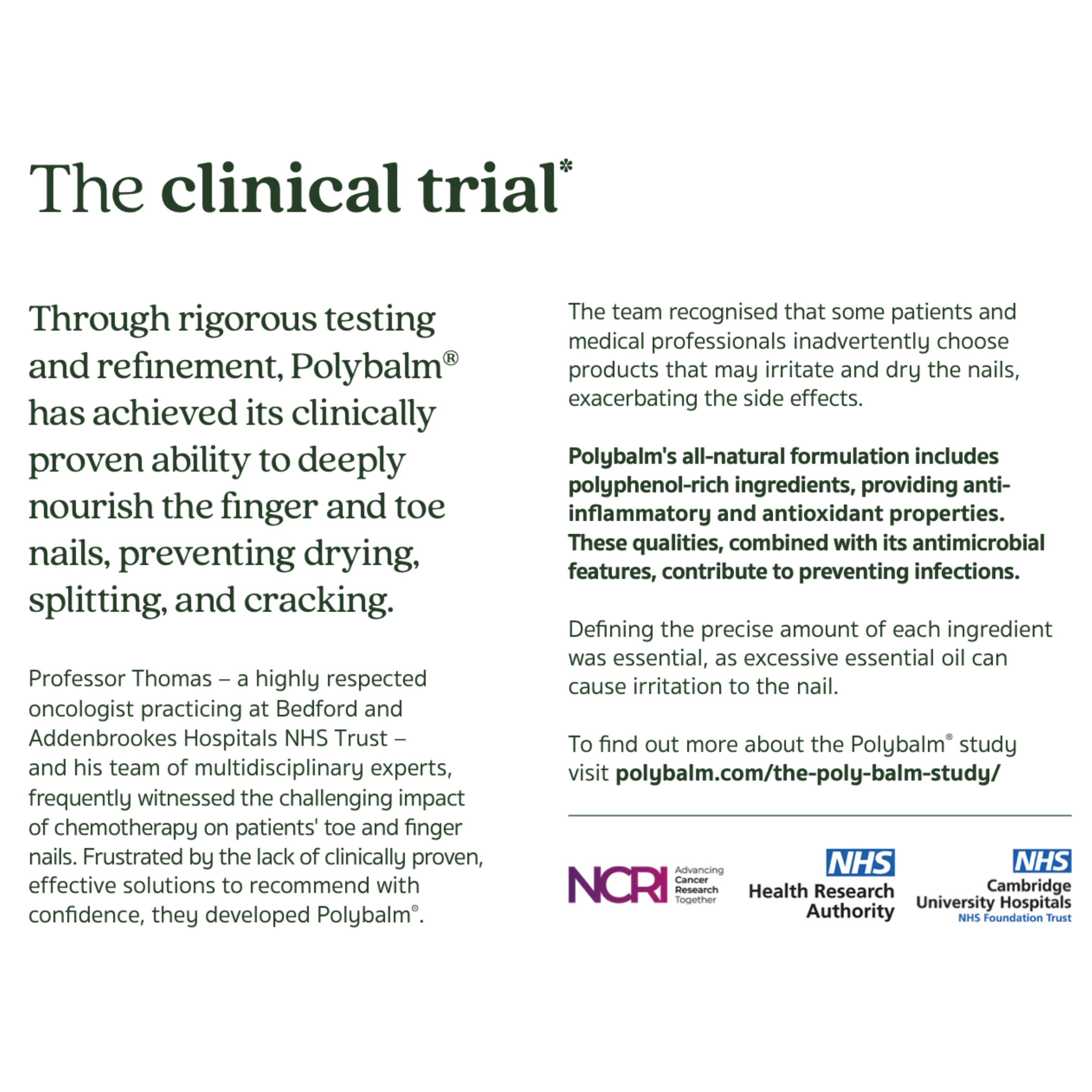 Professor Thomas and colleagues in the NHS developed Polybalm after recognising a lack of effective, safe solutions for nail protection. The balm was formulated with natural, polyphenol-rich ingredients chosen for their antioxidant, anti-inflammatory, antimicrobial, and hydrating properties. The extraction process preserves active compounds while avoiding irritation from harsh chemicals.